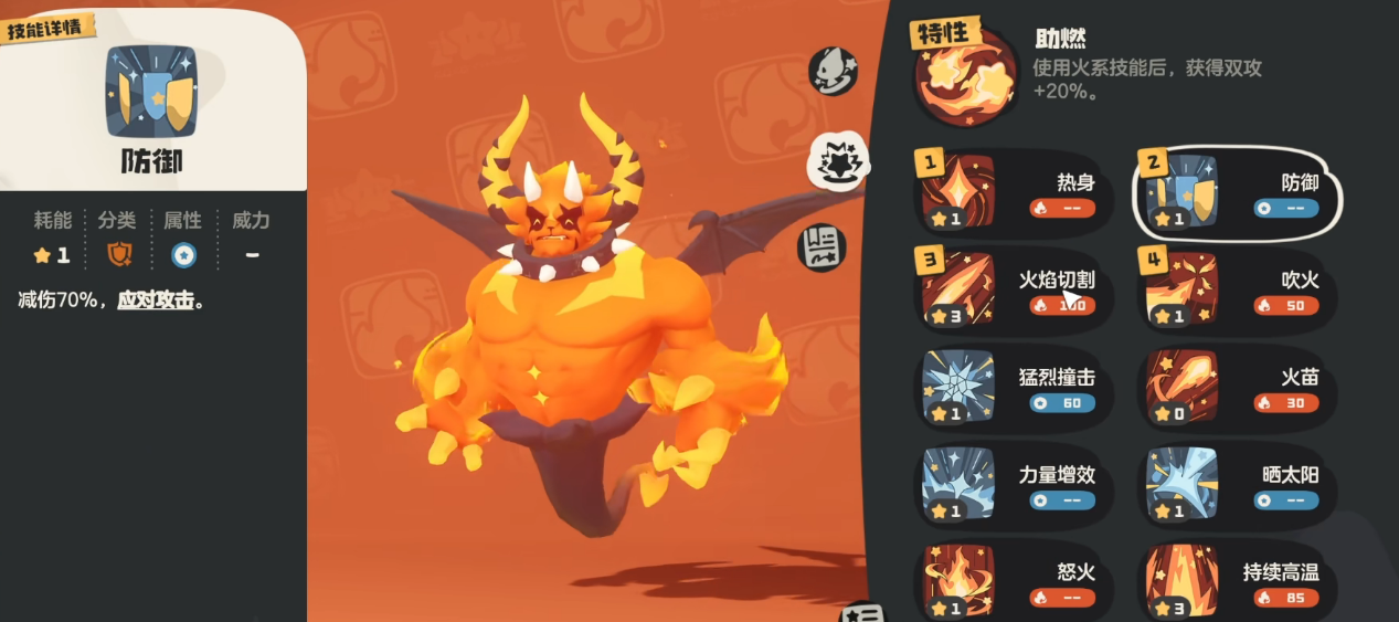 完成进化后,烈火战神将激活“烈焰”血脉天赋,使火属性技能威力提升25%;其特性“烈焰焚烧”可显著提高施加烧伤Debuff的成功率,并同步提升基础暴击率,强化整体输出稳定性。