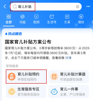 使用支付宝搜索功能,输入【育儿补贴】关键词进入服务页面。