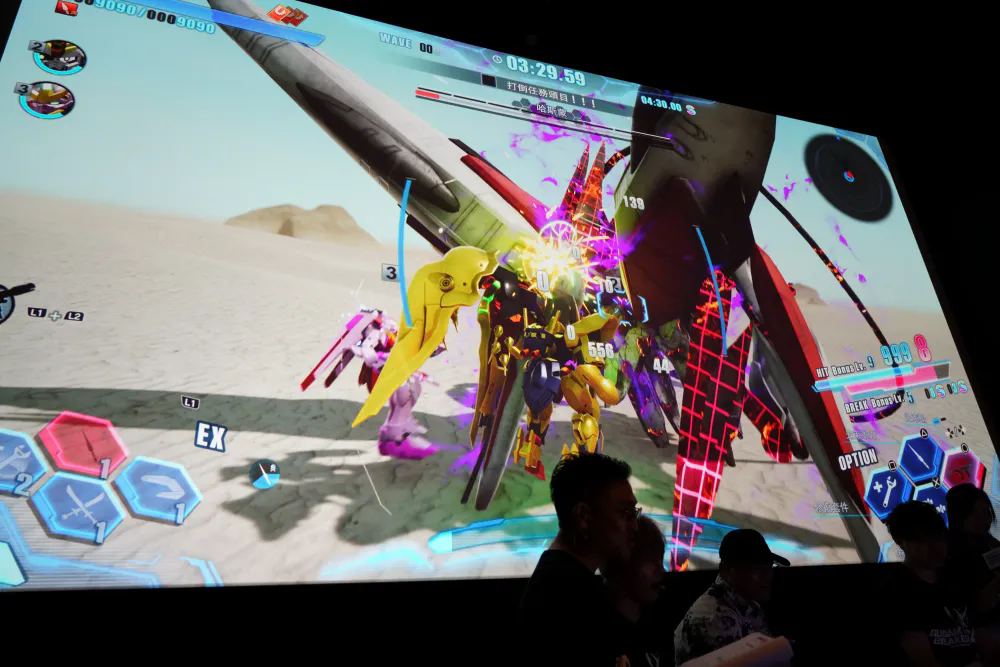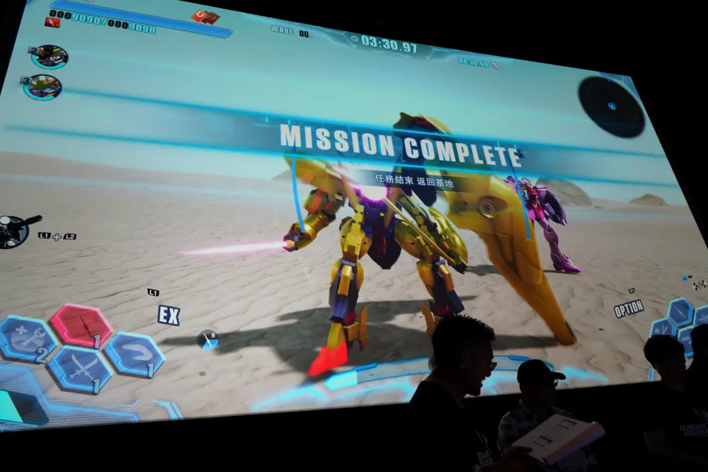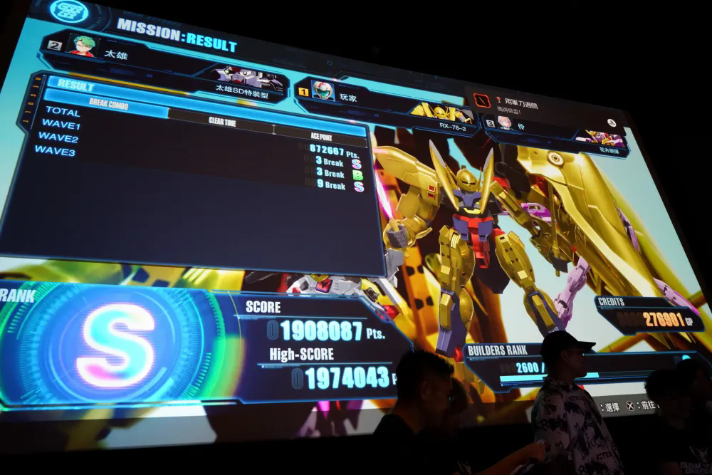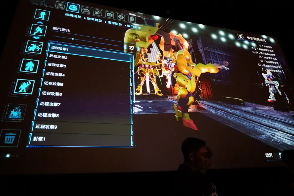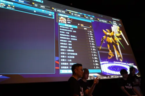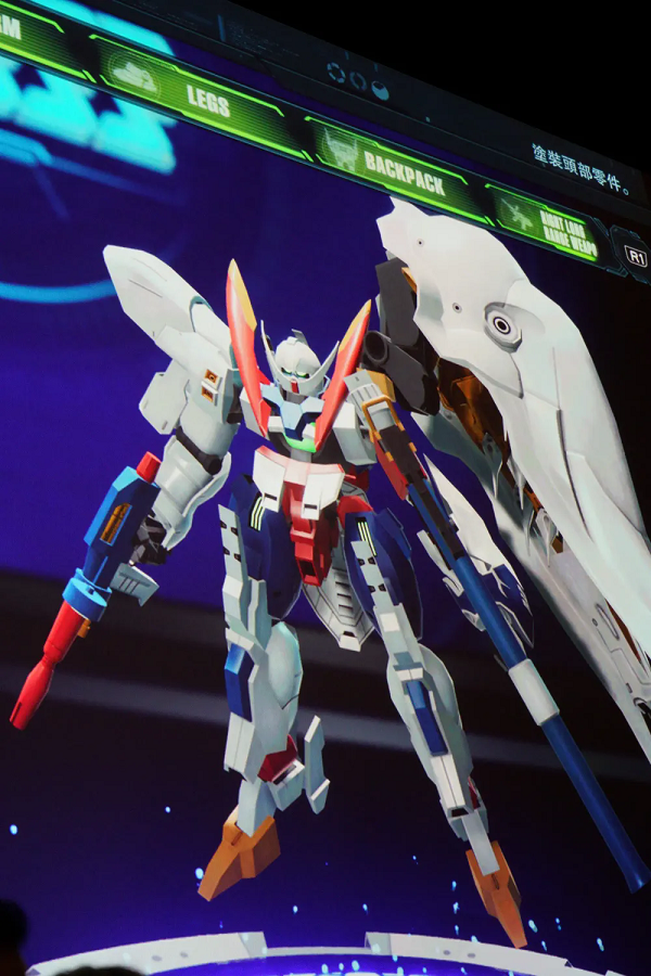 紧接着两位制作人选出两名幸运玩家上台以自创机体挑战故事任务。第一位玩家选择以「上市纪念钢弹」来挑战,技术娴熟的他成功通过三波攻击并击败守关 BOSS「哈斯蒙」并获得 S 级别的优异评价。第二位算是比较少见的女性玩家,则是在台上台下众人鼓舞下选择了 SHINN 打造的「兽人文奈」来挑战,光是出击动画就让人忍俊不禁。这位娇小的女性玩家同样展现了高超的技巧,过程中活用了马形足部特有的「马踢」攻击,三波攻击都拿下 S 级别评价,最终也是以 S 级别的评价通关。SHINN 也不甘寂寞,亲自下场以 “爱机”「兽人文奈」追加任务挑战,只见他更熟练地施展光束长鞭,以超快的速度完成任务并同样获得 S 级别评价。