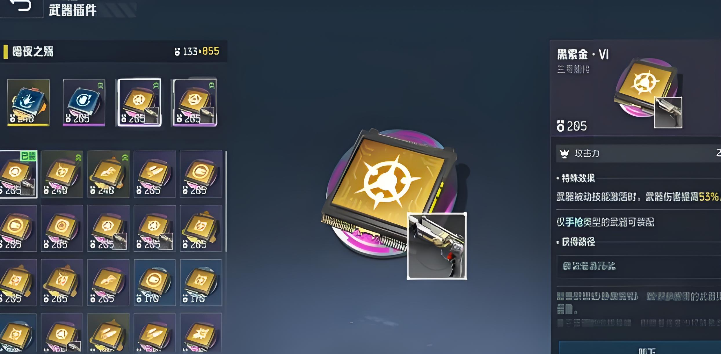若追求更高的伤害上限,“黑索金插件”是不可或缺的选择。该配件与“暗夜之殇”高度契合,激活武器被动后可直接提升53%的伤害输出,这一增益效果在当前所有配件中属于顶尖水平,能显著突破伤害瓶颈。此外,“雷酸汞插件”也值得考虑,它主要作用于技能释放频率的提升,安装后可让技能连发更加流畅,适用于需要频繁触发技能机制的战斗场景。