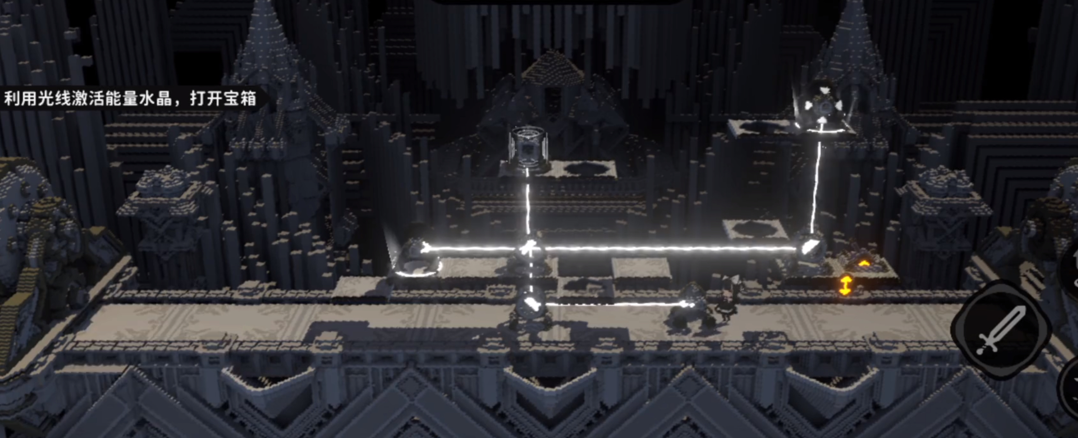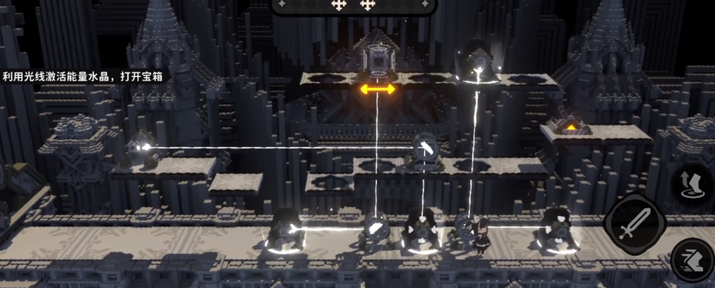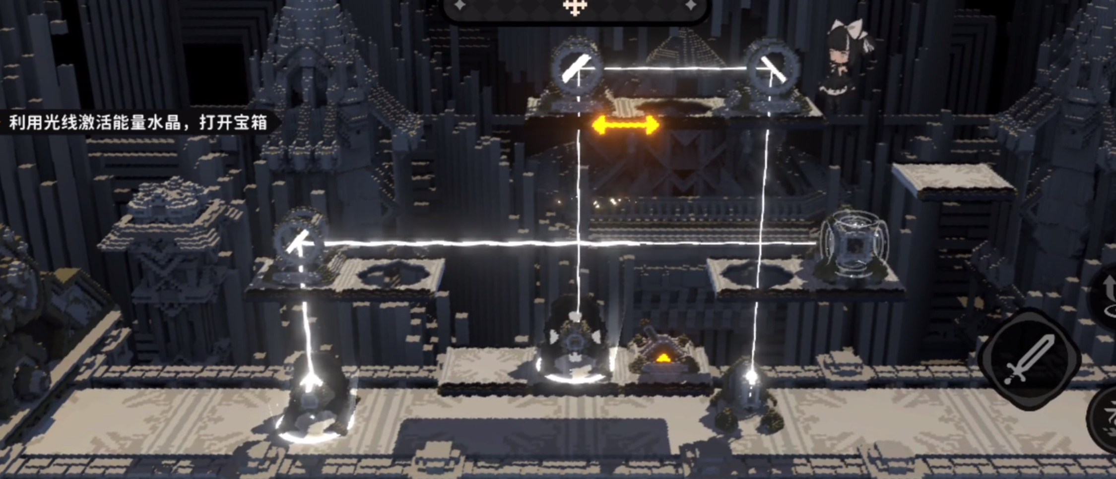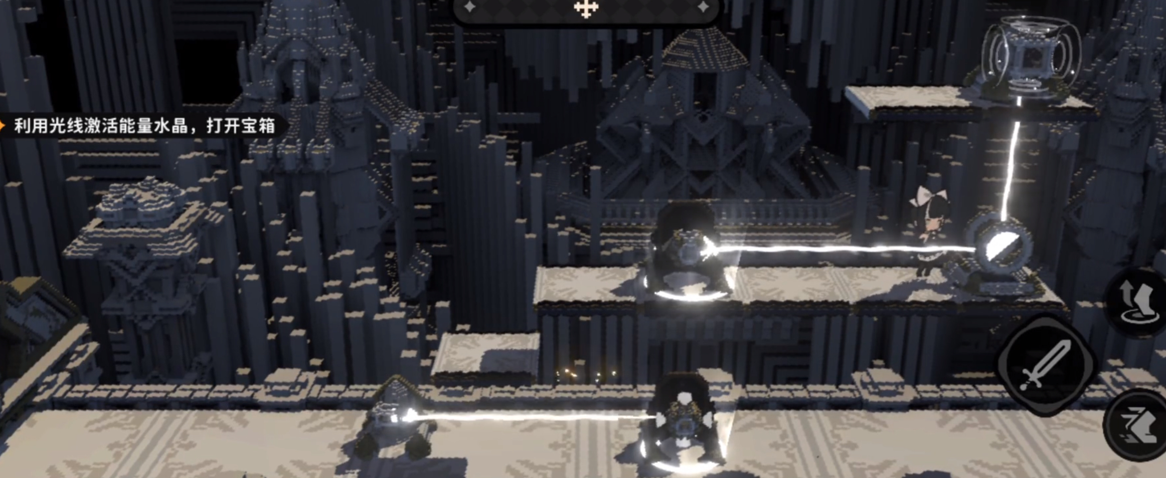 第一关位于白塔智识层,起点处即可找到“寻宝人”。进入挑战后,先触发第一个交互点,随后向右移动并跳跃至第二个平台,调整镜面使光线准确照射宝箱即可完成。第二关生息层则需逐步操作多个镜面装置:抵达第二大平台后翻转镜面令其朝上,使平台下降;接着在中间交互点再次调整镜面方向向上;最后调节右下方镜面,让光束射向右侧目标区域。