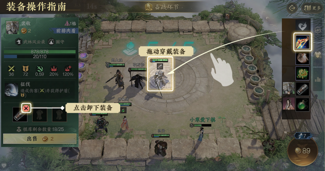 ⑤棋子相关操作 二、关注装备 额外注意,当战斗开始后则无法将装备卸下来了哦~