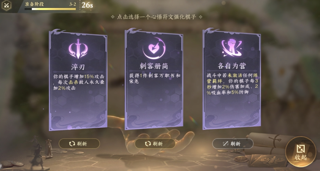 在2-1、3-2、4-2阶段玩家需要选择心悟,分为经济类(帮助获得更多金币)和战力类(直接提升棋子战力),需要权衡进行选择~(如果不满意,每个心悟可以点一次刷新进行更换) 四、关注选秀 选秀环节时,玩家依次上前选择自己想要的棋子。血量越低越先操作。点击屏幕移动角色,触碰到棋子后可以获得该棋子。 关注想要的棋子或装备,抢到他们吧!