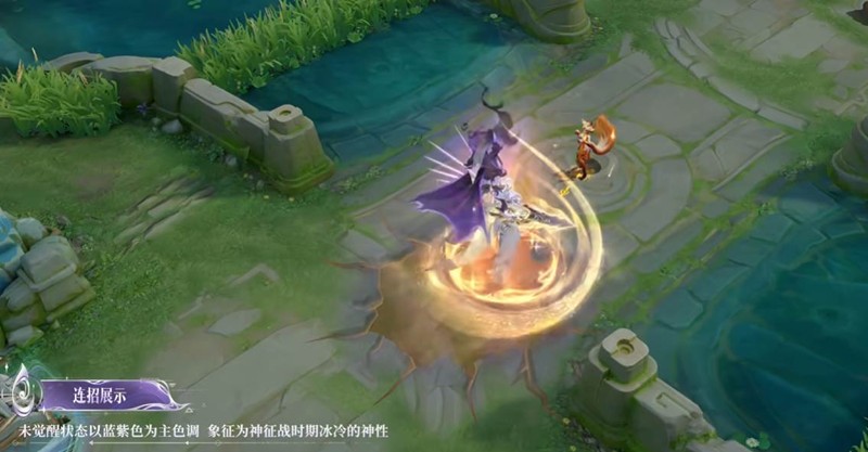技能特效上,未觉醒状态攻击时召唤多把小剑,形成剑阵效果,体现神性操控的秩序感与距离感。真身觉醒状态攻击方式主要与战神之铠协同作战,强调毁灭与包容并存的神力。