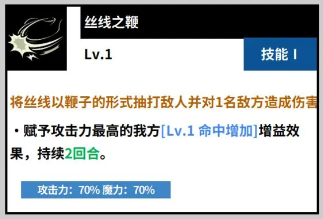 凡妮莎的核心定位是团队辅助型角色,她的第一个主动技能名为“丝线之变”。该技能在释放时会对单个敌方单位造成等同于80%攻击力的伤害,并通过鞭状丝线完成打击动作。攻击结束后,她会为己方队伍中攻击力最高的成员附加持续两回合的增益状态,使其命中率提升25%,从而显著增强主力输出的稳定性与输出效率。