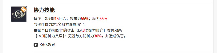 协力技能方面,凡妮莎可以与同伴联合发动攻击,对单一敌人造成基于基础攻击力55%的伤害。协同成功后,不仅能对目标造成打击,还能使凡妮莎和协力伙伴共同获得“防御贯穿”增益,无视敌方30%的防御力,并在此基础上附加额外伤害,极大提升了破防能力与配合输出空间。
