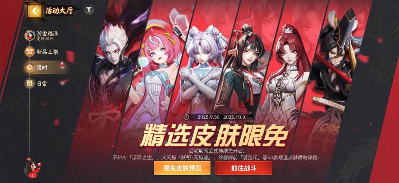 -活动说明:全式神限免即将开启!不知火「浮尽之念」、大天狗「妖相 天狗道」、铃鹿御前「清弦斥」等50款精选皮肤限时体验!