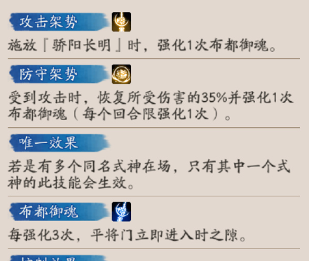 受到攻击时,恢复所受伤害的35%并强化1次布都御魂(每个回合限强化1次)。