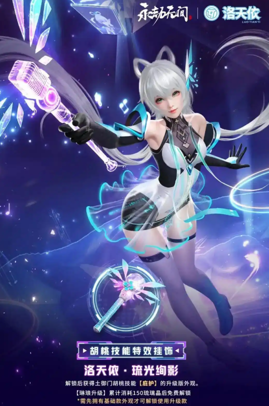 本次联动以胡桃为核心英雄进行主题重塑,在保留虚拟歌姬科技元素的基础上融入全新视觉设计,为传统武侠风格注入现代感。联动内容远不止更换皮肤,更支持多维度个性化设置。胡桃的专属时装采用蓝白配色方案,整体风格高度还原洛天依的经典形象。细节方面表现精细,袖口带有数据流光效,移动时动态闪烁;背部配有中国结造型小挂饰,巧妙融合国风与数字美学。该时装可单独购买,也可通过捆绑包获取,后者额外包含斩马刀皮肤——刀身呈现星空纹理,挥动时散落细碎光点,整套搭配极具辨识度。
