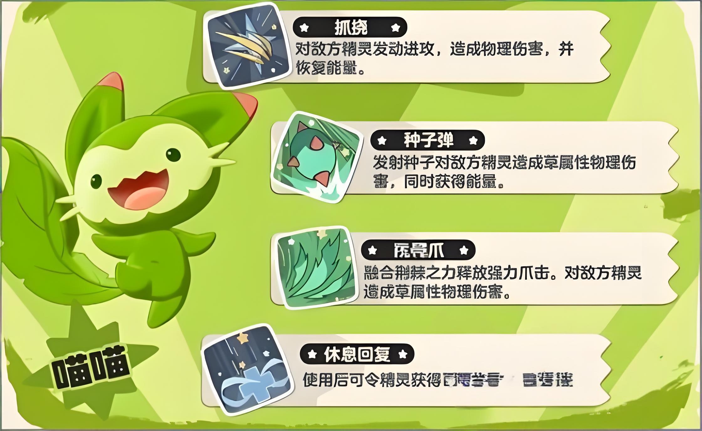 草系精灵初始形态为绿色小猫,最终进化体为魔力喵,种族值达到606,兼具输出与生存能力。其核心优势在于强大的续航机制,包括吸血、晴天回血以及满血复活等特性,配合寄生种子可在长时间战斗中实现近乎无限的生命恢复。同时拥有群体催眠与种子炸弹等控场输出技能,适合打持久消耗战。无论是单人挑战高难副本,还是参与策略对战,草系都展现出极高的容错率与战术灵活性。若追求开荒速度,推荐优先培养火系;若侧重PVP体验,则可考虑草系或水系发展。通过联机系统,玩家之间可共享御三家果实,由好友投放后使用猫头鹰进行捕捉即可获得。完成指定场景任务后,也可直接触发捕捉事件。
