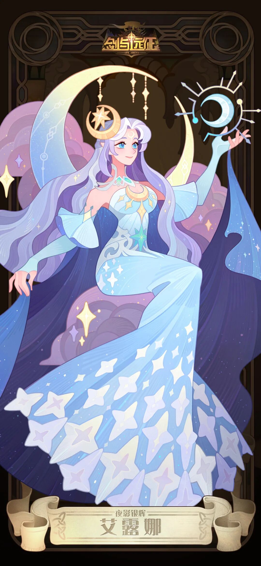 被动效果:艾露娜登场时,会在战场上展开“月影幻域”,幻域内依次出现“新月”/“弦月”/“凸月”/“满月”四种月相位阶;友方英雄累计施放一定次数非普攻主动技能时,月相向前推进一个位阶。