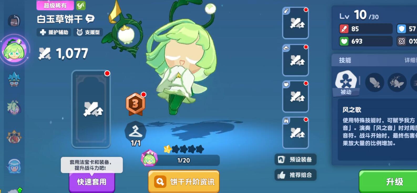 其被动技能“风之歌”在释放特殊技能时为己方附加“风之音”状态,进入演奏模式后会周期性发射音符造成伤害,并且战斗开始阶段可根据增益层数提升最终伤害。搭配核心法宝卡“温柔的希望”(超级稀有),可使被动伤害提高50%,并在开局自动获得一段旋律;使用终结技消耗旋律生成“和音”状态,使全队属性伤害提升32%,持续15秒。尽管该技能冷却时间较长,但增益效果稳定且可循环。每累计触发被动20次即可重新获取旋律。若再配合“疾风耳语”(稀有级法宝卡),每次触发风之歌时有30%概率返还1点旋律值,进一步增强续航能力。因此,白玉草饼干在后期无论是PVE还是PVP环境中都能发挥关键作用,是提升团队容错率的理想选择。