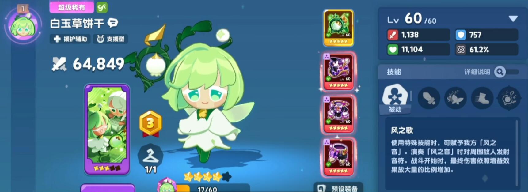 作为超级稀有级别的角色,白玉草饼干在满级60级时的基础属性为攻击1138、防御757、生命值11104,效果命中与抵抗达到61.2%。较高的血量保障了其战场存活能力,而超过六成的效果命中则有效提升了技能触发的稳定性。不同于传统纯治疗类辅助,它在提供增益的同时还能参与输出,60级攻击力相当于同阶输出角色的70%,这一设定让队伍配置更具弹性,适应多种战斗环境。
