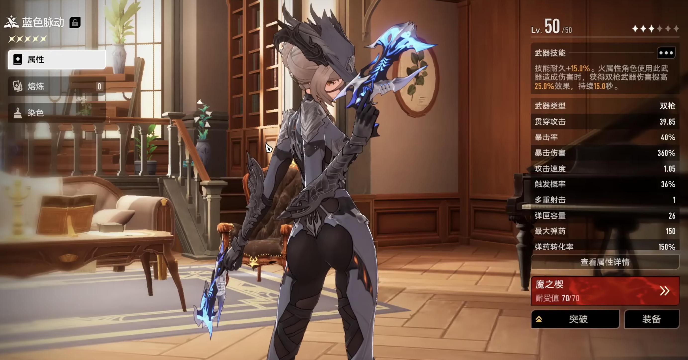 作为一把五星品质的手枪,蓝色脉动在基础性能方面表现出色:攻击力为5,暴击率为20%,暴击伤害达到200%,整体数值在同类武器中处于上游水平。其触发概率为20%,弹匣容量为20发,最大携带弹药量为150发,攻击速度设定为1倍速,属于标准的速射节奏配置。