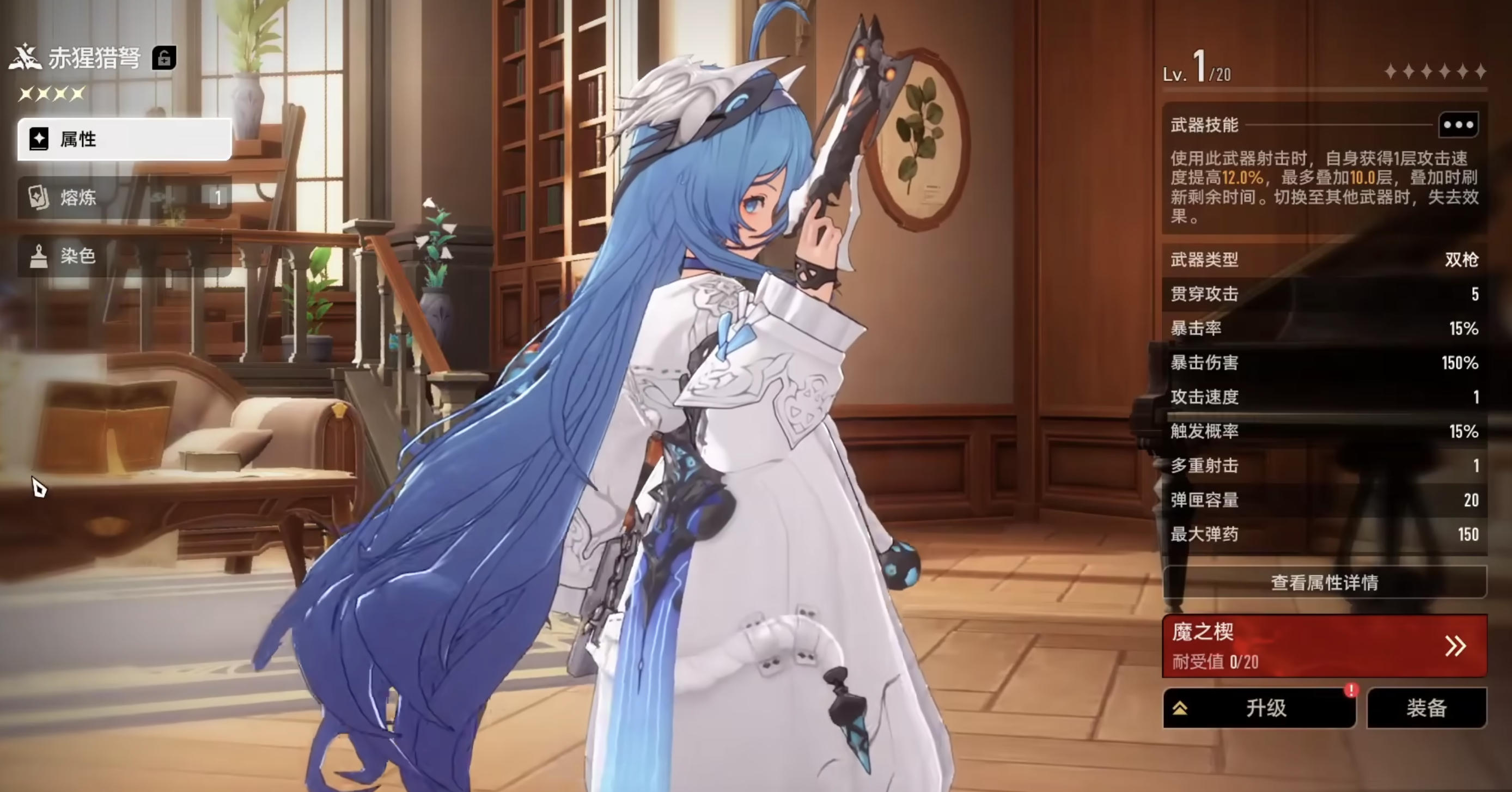 赤猩猎弩是一把四星手枪,虽然稀有度低于五星武器,但其机制独具特色。基础攻击力为5,暴击率15%,暴击伤害150%,面板数据略低。弹匣容量和总弹药量分别为20和150,技能触发概率为15%。