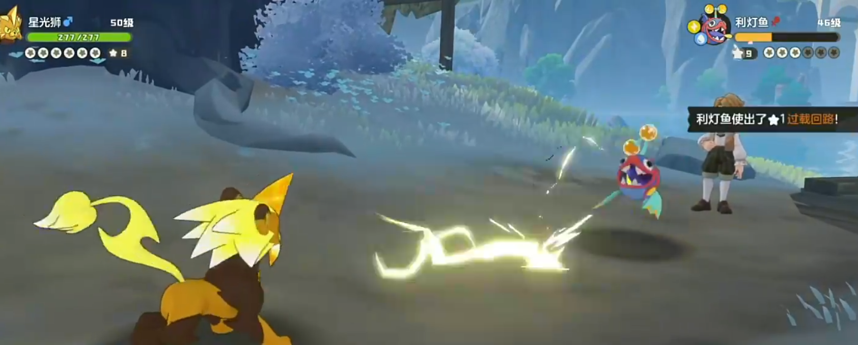 首场对决中,基恩派出的是兼具电系与水系特性的利灯鱼。考虑到电系技能之间存在相互抵抗特性,推荐使用星光狮出战,连续释放两次两星技“离子火花”即可完成击杀。紧接着出场的是纯水系精灵蓝蝶鲨,电系对其具有明显克制效果,无需更换精灵,直接使用一次离子火花便可取胜。