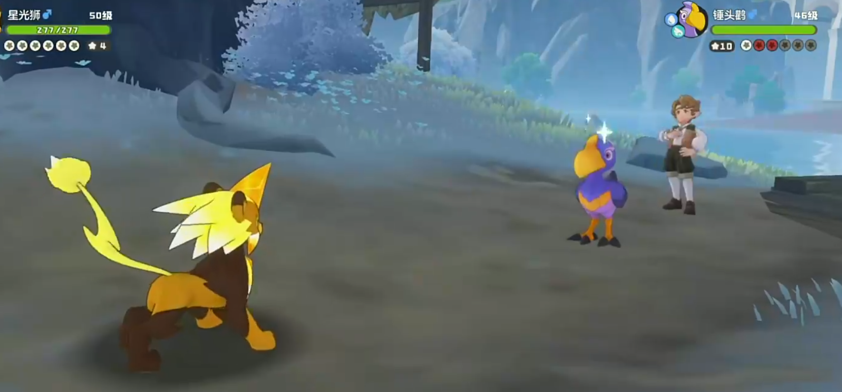 第三位对手为同时拥有水系和翼系属性的锤头鹤,面对该目标依然可沿用星光狮战术,单次释放离子火花即可获胜。成功通关第一轮后将进入第二阶段对战,此阶段属性克制关系会导致伤害翻倍,需格外注意阵容选择。第二局首位登场的仍是具备对流特性的利灯鱼,继续使用星光狮应战仍能稳定取胜。