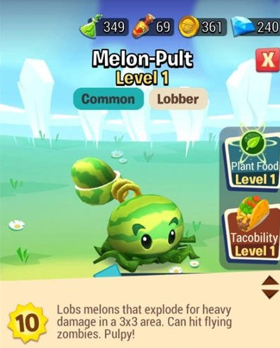 西瓜投手最大的优势在于其范围攻击特性。每次投掷的西瓜命中目标后,会以落点为中心对3×3区域内的所有单位造成伤害。无论是密集推进的僵尸群还是单独出现的敌人,都能被高效清除,清场效率非常出色。更值得一提的是,该植物仅需10点阳光即可种植,在资源积累较慢的游戏前期,这样的低消耗极具战略价值,适合早期布防部署。