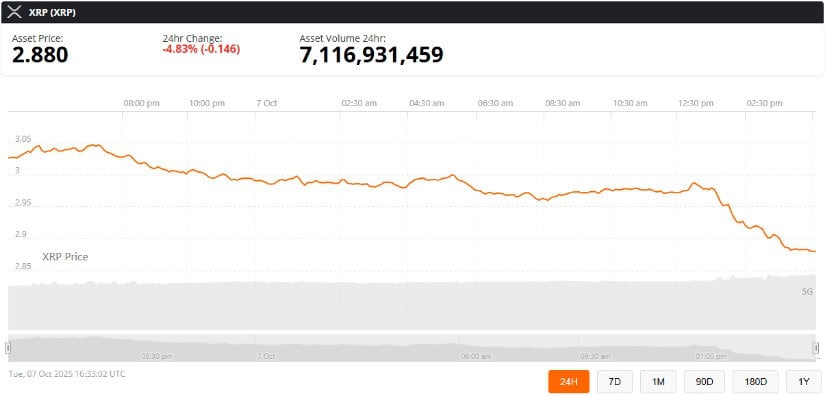 截至发稿,XRP报2.88美元,24小时下跌4.83%。来源:Brave New Coin