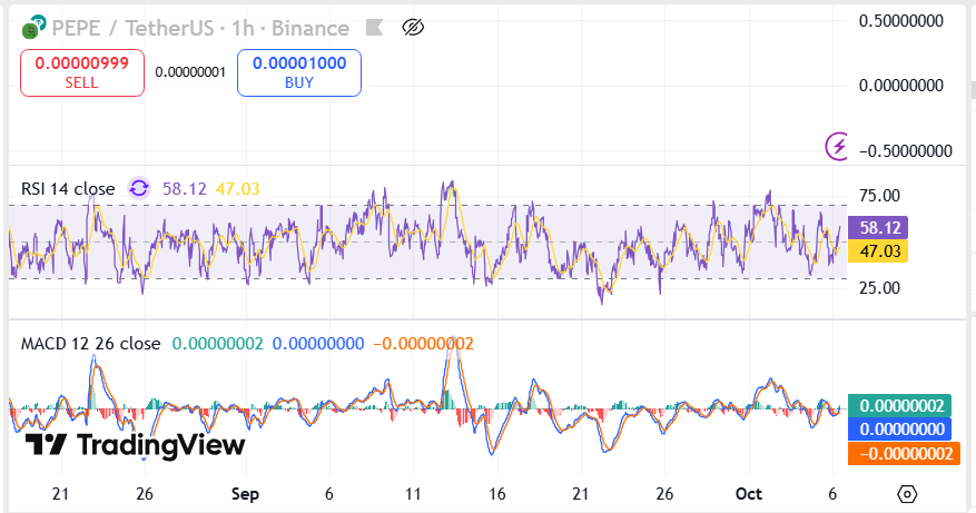 Pepe价格呈现三角收敛形态,当前交易价为0.000009932美元,指标中性,对比特币和以太坊呈现涨跌互现走势。