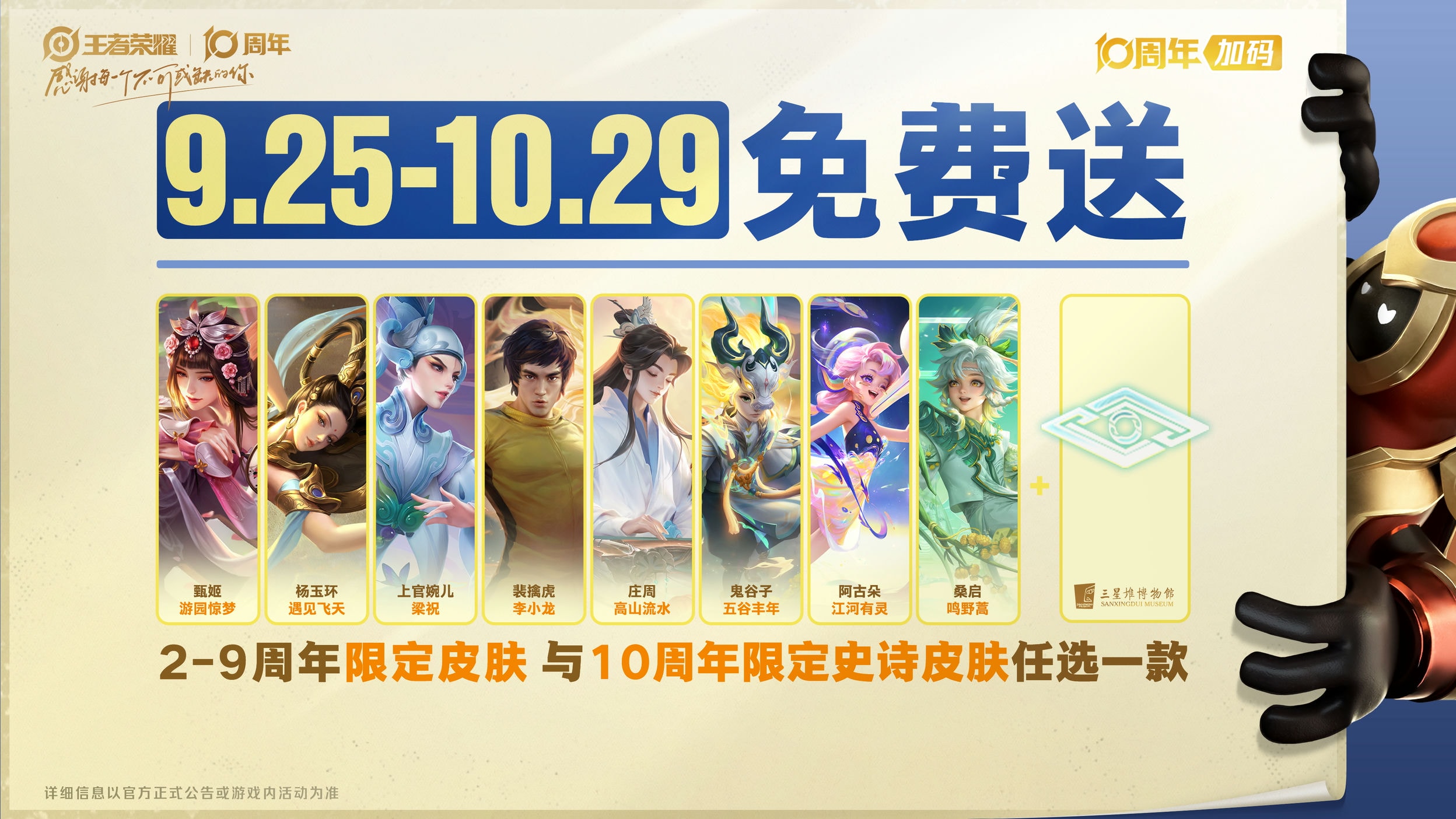 福利9:【十周年福利加码】送2-9周年限定皮肤与10周年限定三星堆主题【史诗】皮肤:任选1款免费送,目前活动已上线,10.15开放领取哟