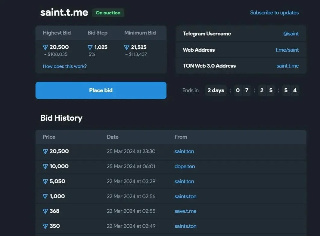 截至撰写评论时,最高出价为20,500 Toncoin(约108,035美元)。参与拍卖所需的步骤为1,025 Toncoin(5%)。离拍卖结束还有2天7小时。
