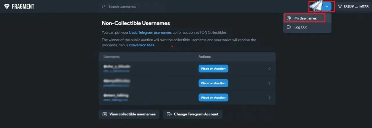 通过进入个人账户菜单中的“我的用户名”部分,您可以将注册的Telegram用户名放出售。点击该部分,Fragment将显示您可以出售的选项。
