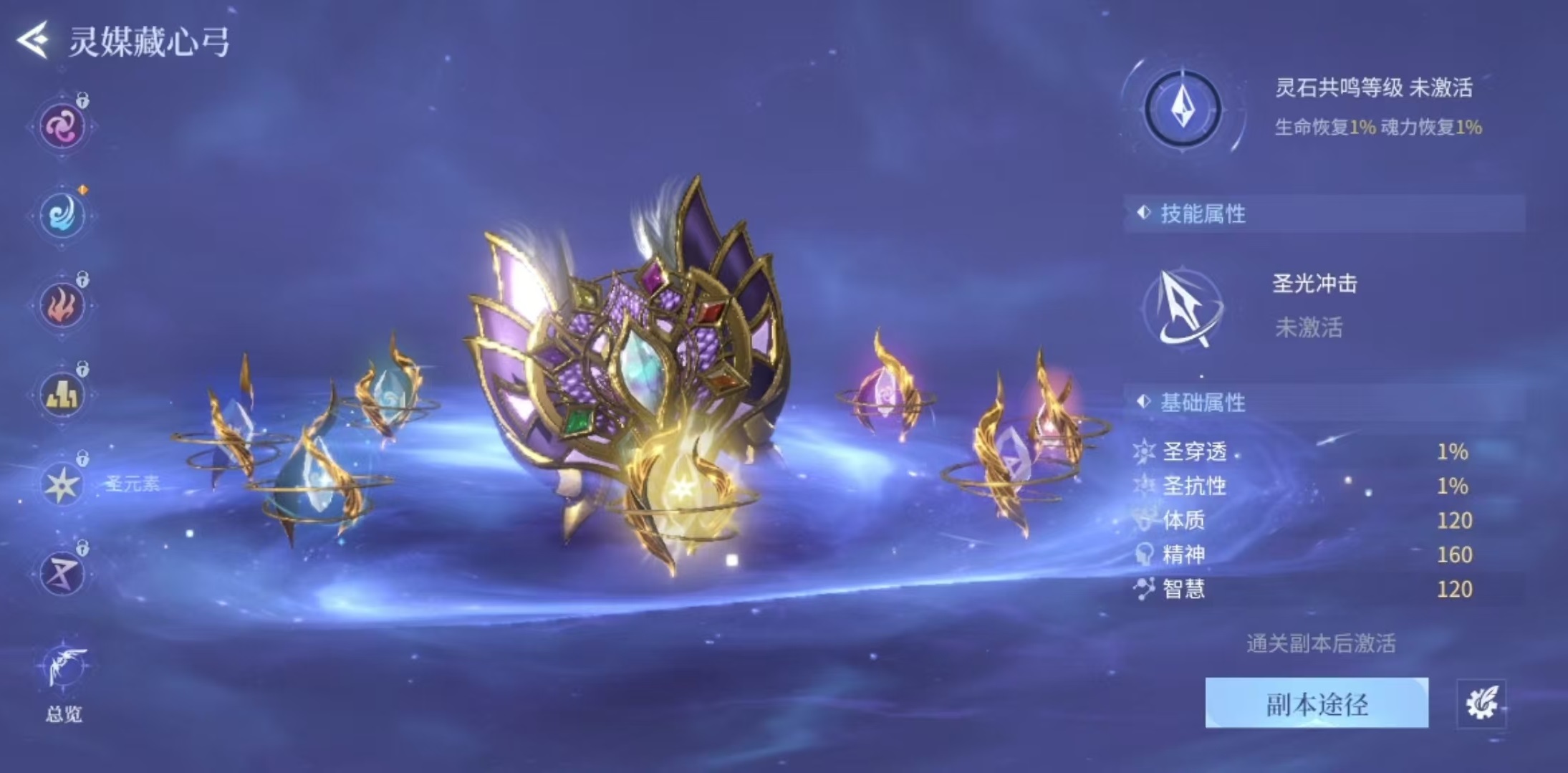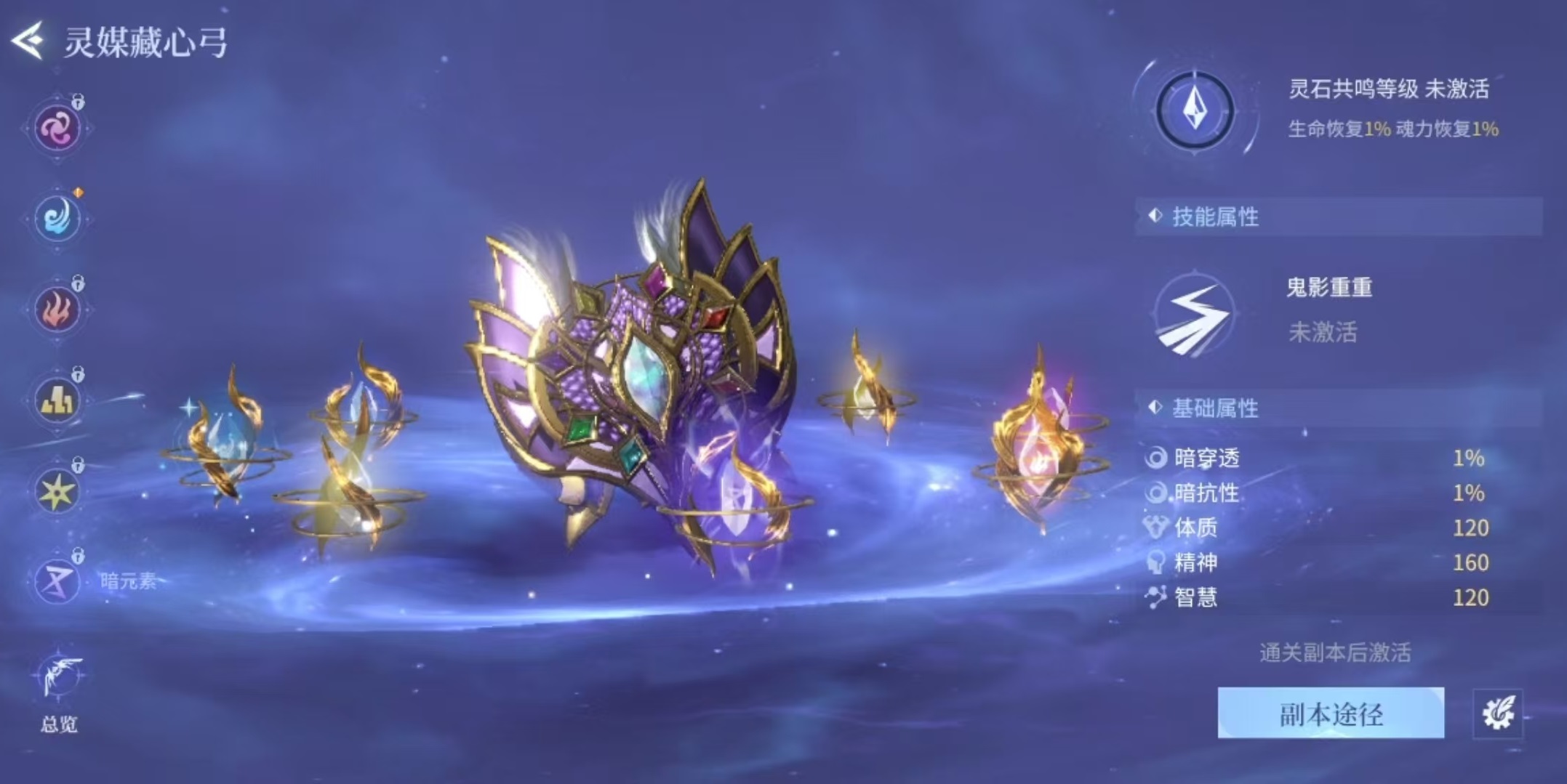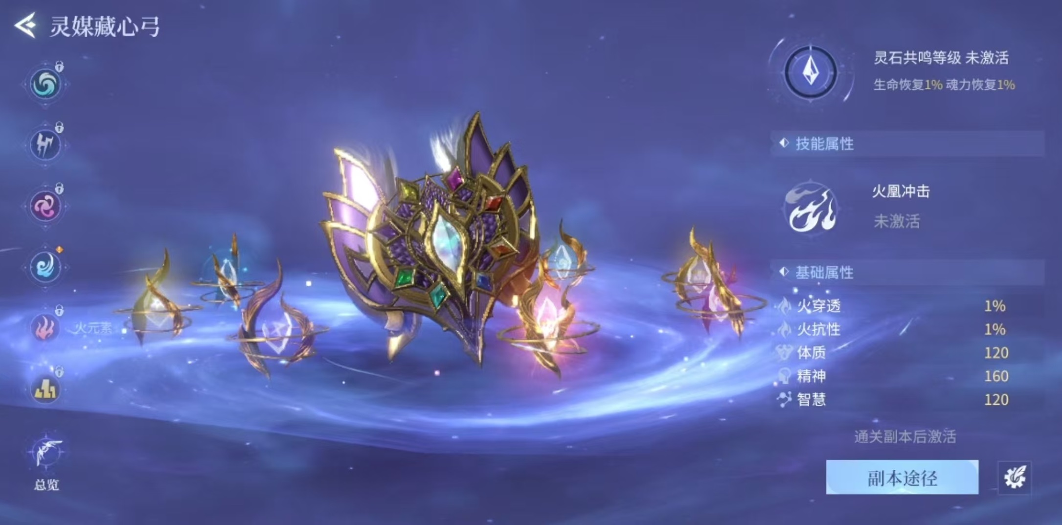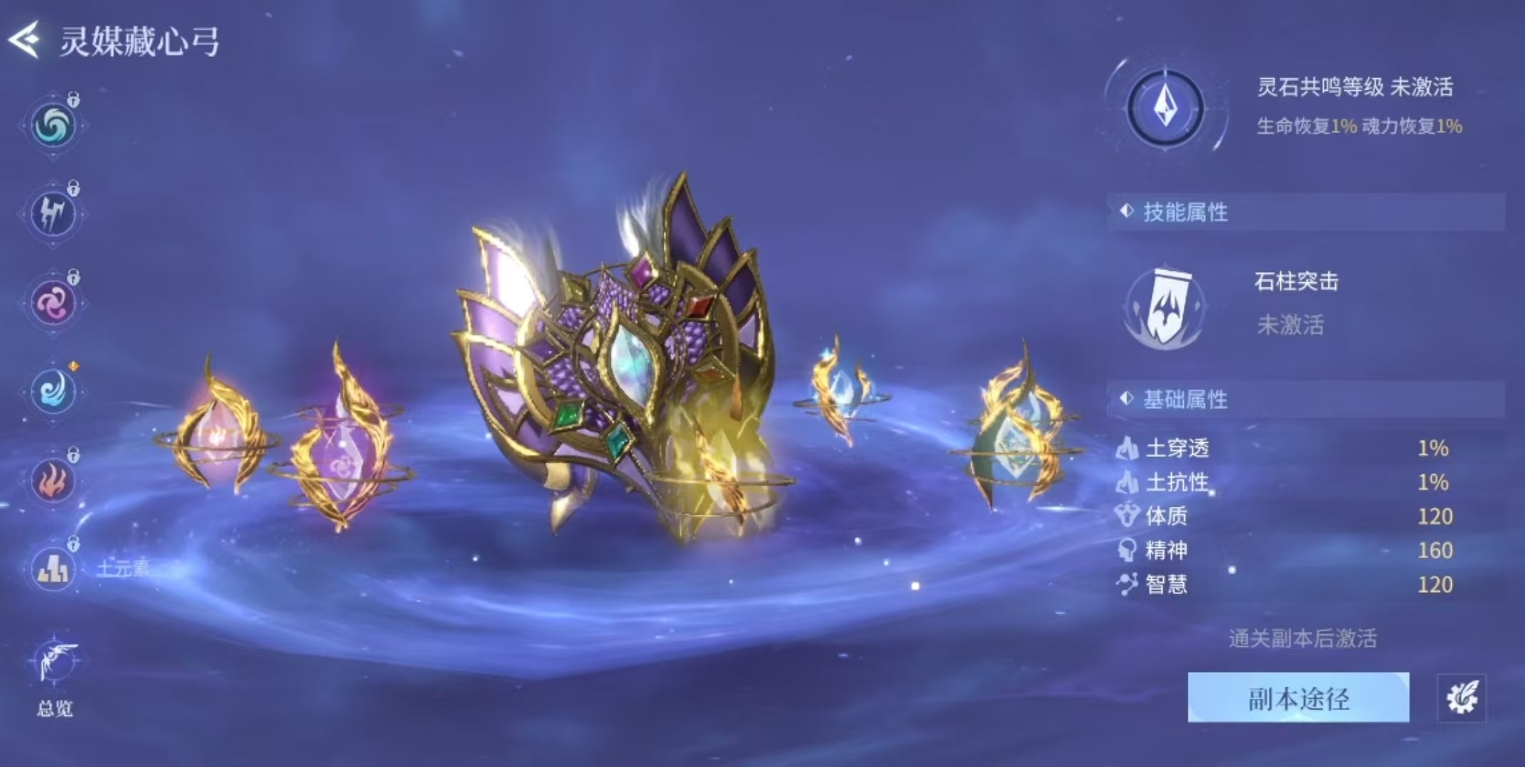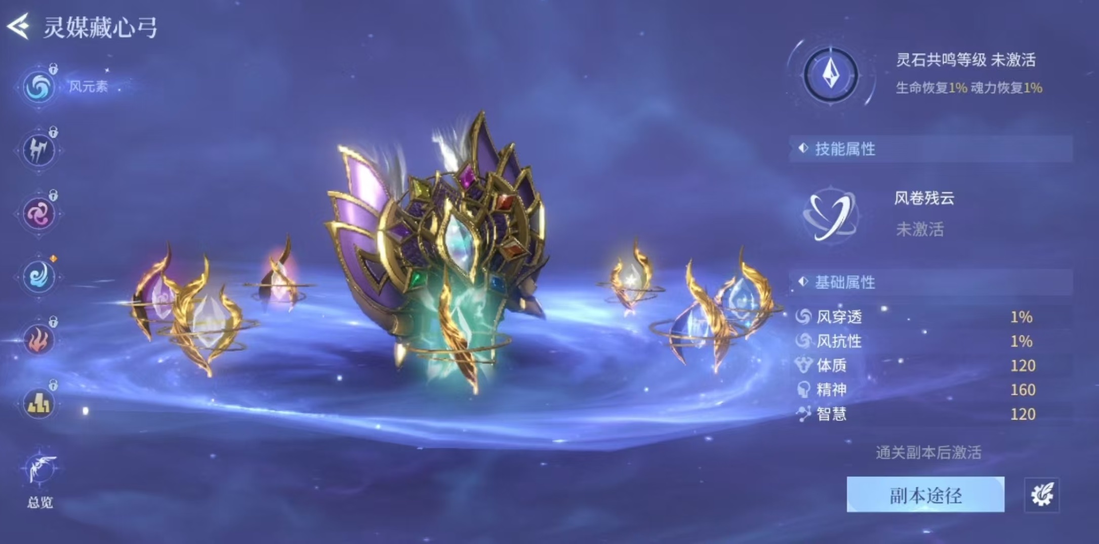 进入游戏主界面后,可在暗器功能旁找到“灵弓”入口。需要完成特定副本挑战后,才能逐步解锁不同属性类型的灵弓。该系统正式名称为“灵媒藏心弓”,共包含八种形态,分别对应七种基础元素:风、雷、水、火、土、毒、圣,以及特殊的暗属性。每种灵弓需通过刷取对应关卡激活,之后即可在实战或探索中灵活调用。每个灵弓具备双重效果——一是主动施放的范围技能,二是蓄力发射的元素箭矢。例如,在探索过程中遇到元素图腾时,使用相性匹配或克制的灵弓可影响印记获取数量,从而推进任务进度。