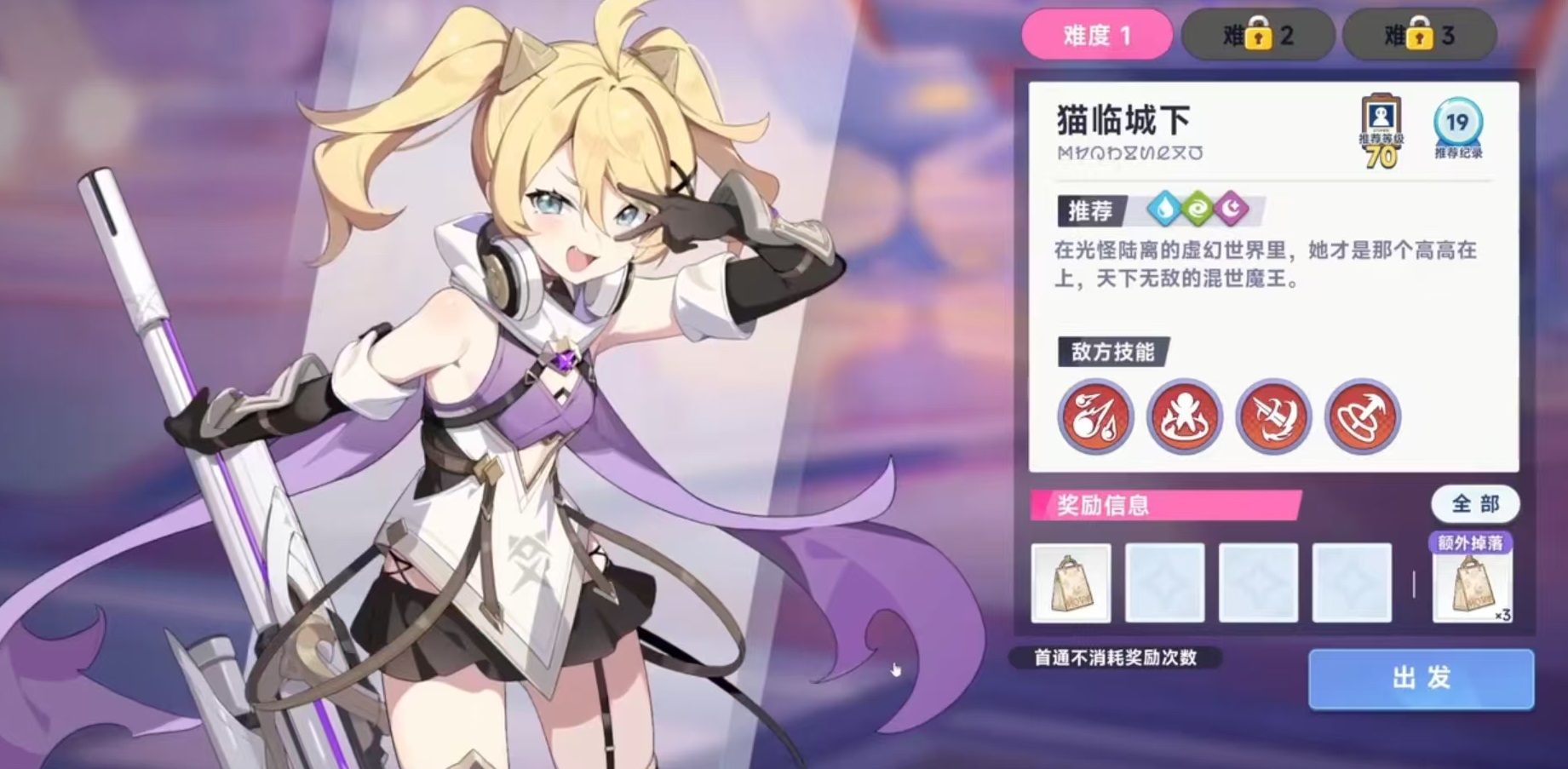 另一典型关卡为“猫临天下”,玩家将面对一位猫系设定的混世魔王少女,同样设有三个难度层级。最低准入等级为70级,推荐使用水、风或暗属性队伍应战。值得庆幸的是,系统会在关卡界面明确提示推荐使用的属性类型,帮助玩家快速锁定适配阵容。然而,想要稳定推进所有内容,仍需确保自身英雄池足够深厚,各属性均有可堪大用的角色储备。这种多维度培养需求正是巅峰揭幕被视为高门槛活动的核心原因。