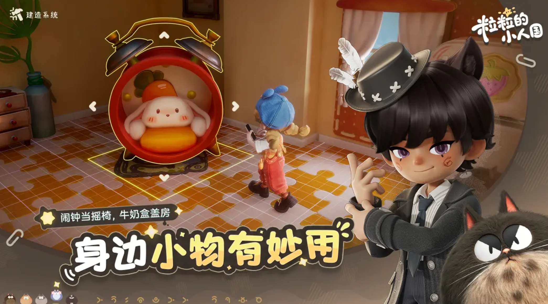 在玩法方面,粒粒的小人国支持自由装饰与DIY建造,玩家可利用收集到的微型材料改造场景、搭建居所。高低错落的空间结构带来差异化的移动体验,进一步丰富了探索维度。同时,游戏中设有多个NPC角色,彼此之间存在互动关系,玩家可通过交流任务或合作模式实现社交联动。生活化机制的加入也让整体节奏更加轻松惬意,适合追求慢节奏休闲体验的用户。