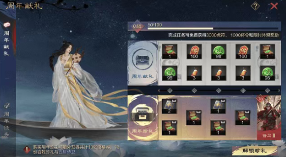 通过付费解锁周年珍礼,可以额外获得10份招募券、五星侍卫、永久聊天气泡以及额外的“百姓珍礼”宝箱。