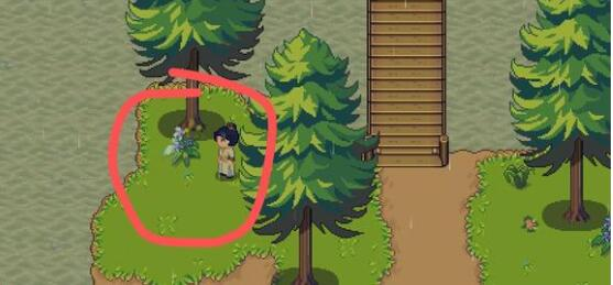 接下来是另一项一星任务材料——“野琴花”。该材料为解锁水井传送至江城山道的关键道具之一,而水井传送功能需通过修复天机庙获得。初始采集点位于某灌木丛附近,交互后有机会获得野琴花、逢春叶和禽蛋。另一个稳定产出点位于江城山道左侧,沿楼梯下行并穿过桥梁后,可见一株显眼花卉,此处同样可收获上述三种资源。
