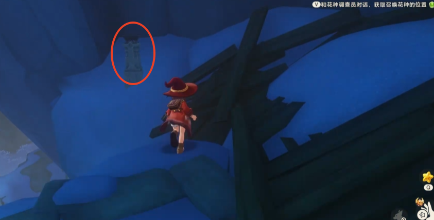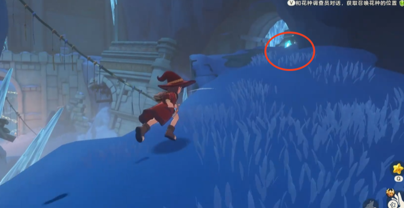 离开洞穴后,沿墙壁前进,借助冰晶地形攀爬至高处。此时可望见远处小坡上的星星图标,拾取后继续前行,前方有明显裂痕的墙体已被破坏,内部藏有第四支火炬。成功点燃后,四支火炬全部亮起,原先封锁的门随之开启。