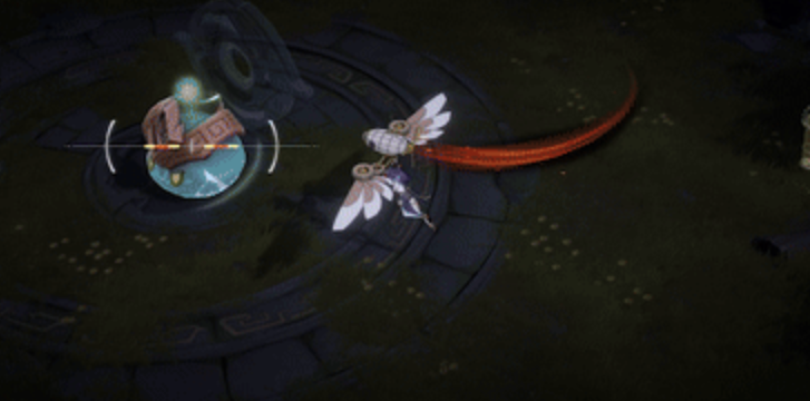 技能一“飞翼急袭箭”可向前方射出一支强威力箭矢,造成可观伤害与削韧。若在移动中施放该技能,菲奥将朝当前移动方向进行位移;若周围已有“伊卡洛斯”存在,则会立即激活“飞翼突袭”,发动一次高速冲刺攻击,对路径上的敌人造成大量伤害与控制效果。无论哪种形式释放,该技能均可为菲奥提供一定量的觉醒值,并命令现存的伊卡洛斯协同攻击目标。