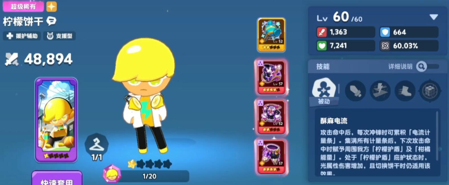 在饼干人联盟IP系列手游中,柠檬皮饼干作为一位跨圈层的人气角色,自上一代起便稳坐颜值代表的位置,其定位颇似LOL中的EZ,兼具人气与实力。而在本作中,柠檬饼干被设定为超级稀有的支援型单位,拥有出色的团队辅助能力,在组队战斗中表现尤为亮眼。凭借酥麻电流提供稳定的护盾保护,同时借助法宝卡“悠闲的下午”提升全队暴击伤害,使其在PVE推图和PVP对战中都具备极高的适配性。