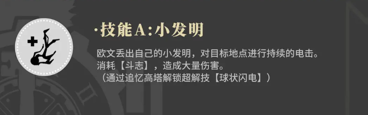 技能一为“小发明”,欧文可在指定位置释放持续电击效果。若斗志值较高,则电击伤害也会随之增强。该技能在升级为超解技后,将转变为球状闪电形态,覆盖范围更广,电属性伤害输出更为显著。技能二名为“论证壁垒”,能够消耗已累积的耐力值来抵消敌方攻击所造成的伤害,起到类似护盾的作用。