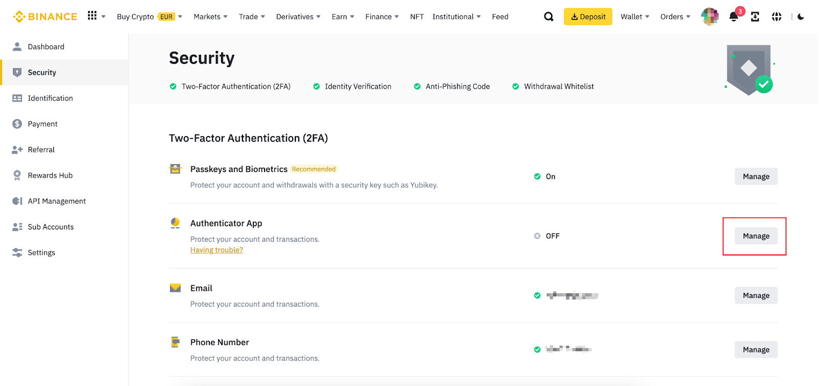 1. 要重置您的身份验证器,请进入[安全]页面,然后单击身份验证器应用程序部分中的[管理]。