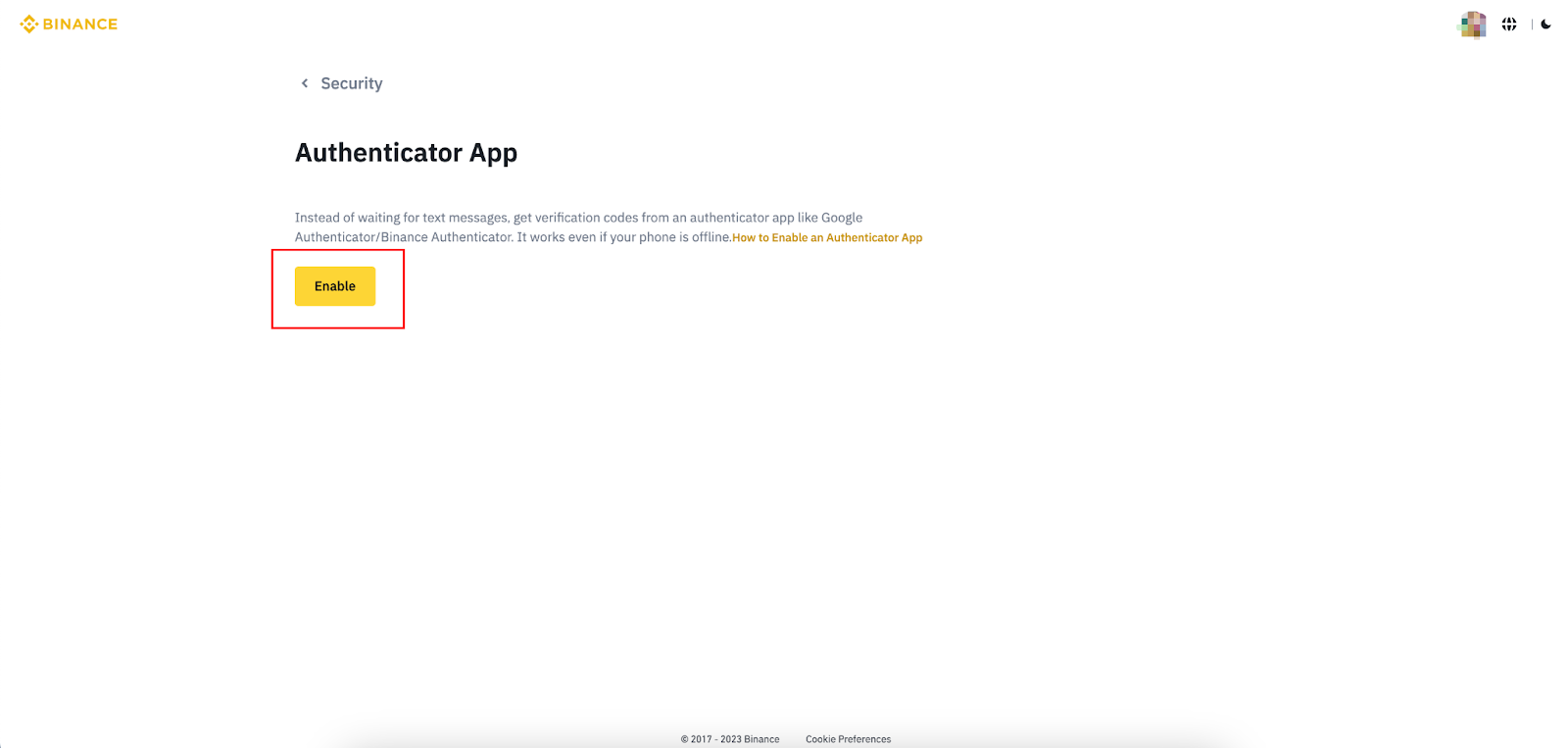 1. 登录您的币安账户,点击【个人资料】-【安全】。点击此处的[下载 Binance Authenticator],将该应用下载到您的手机上。