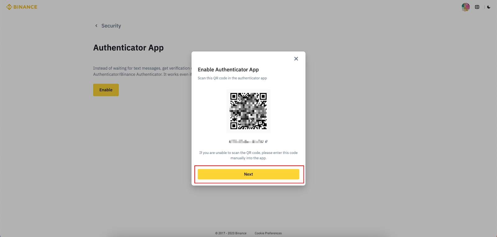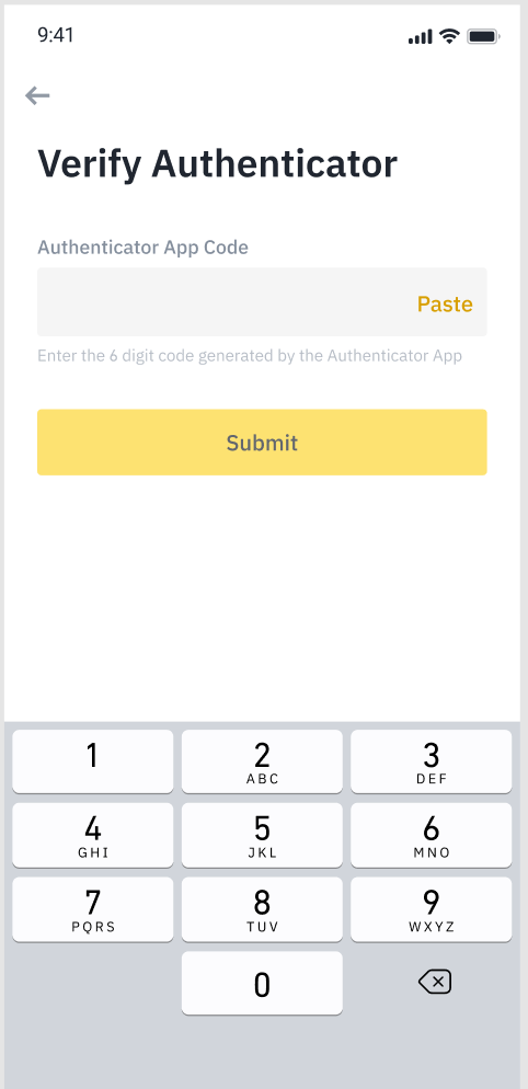 5. 返回币安应用程序,使用您刚刚启用的币安身份验证器验证您的设置请求。点击[下一步]并输入您的币安验证器的 6 位代码。然后触摸【发送】。
