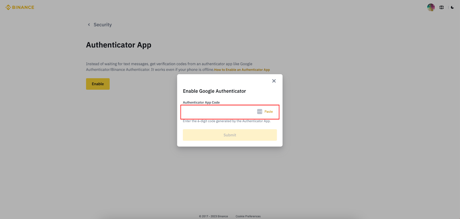 7. 为了为您的账户启用币安身份验证器,您现在必须使用币安身份验证器的 6 位数代码确认该过程。输入代码后点击【提交】。
