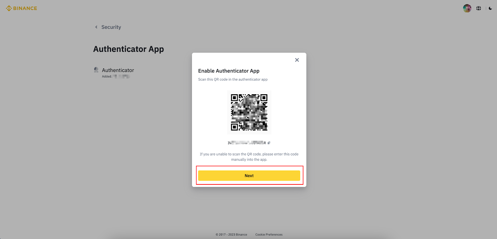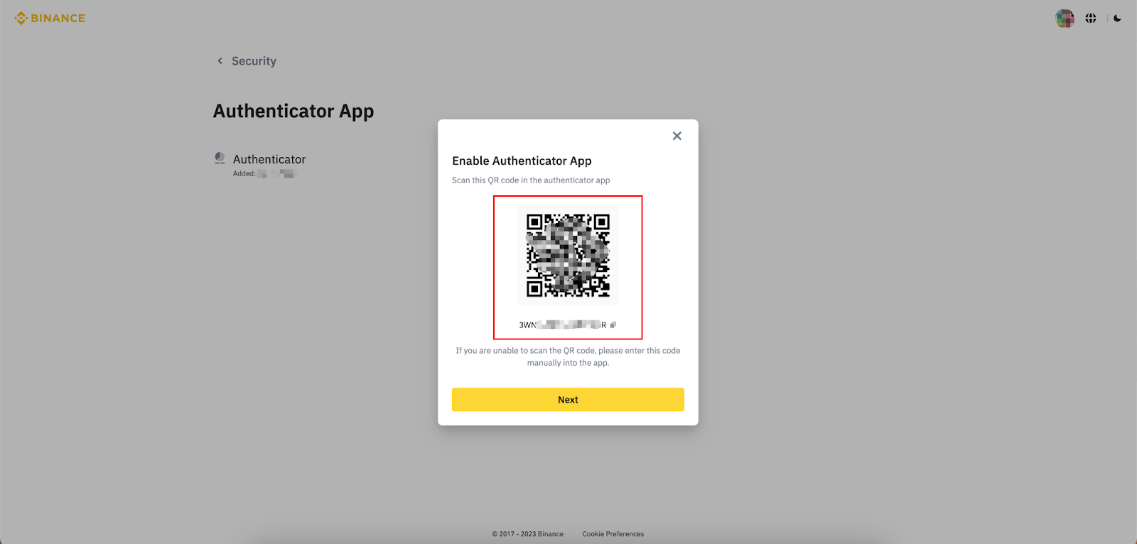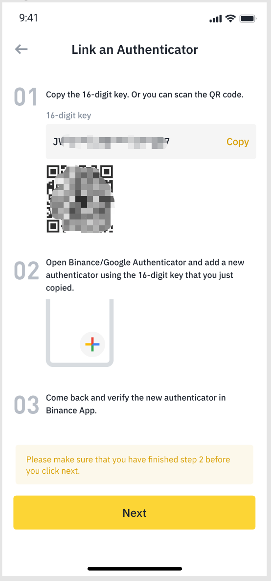 5. 您将在屏幕上看到二维码和 16 位密码。打开币安验证器应用程序并扫描二维码,或手动输入16位密钥。