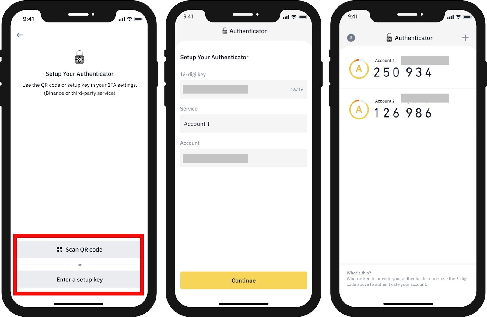 打开手机上的币安验证器应用,手动输入16位密钥或扫描二维码。