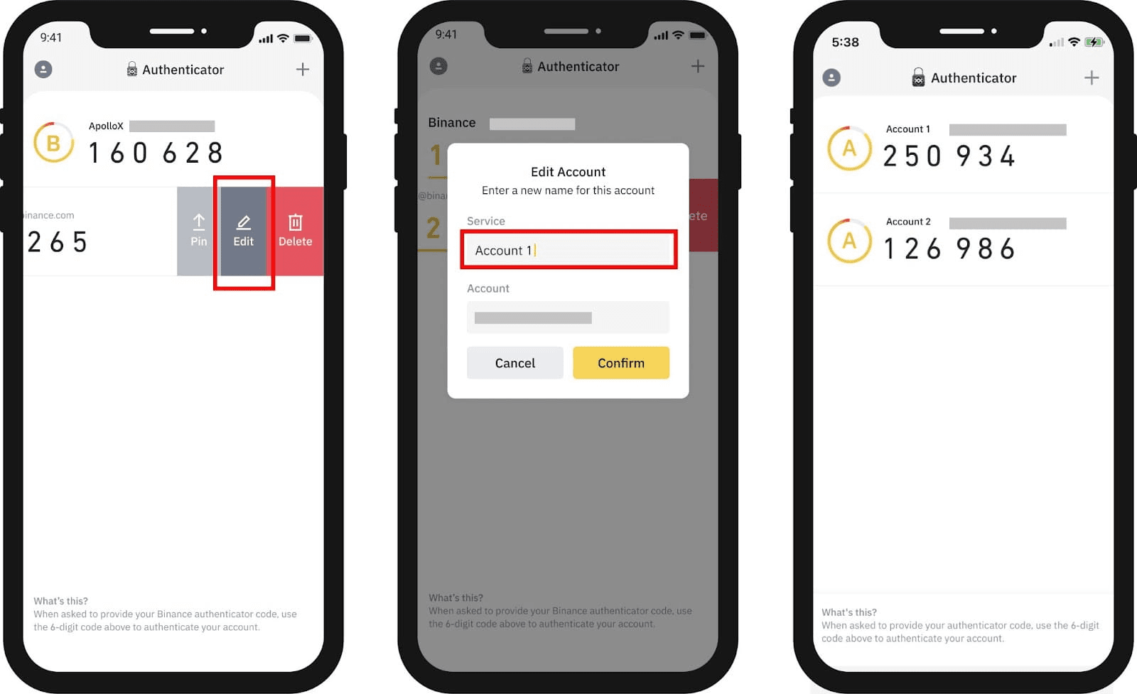 3 如果您向币安身份验证器添加了多个账户,您可以将每个代码滑动到一侧,然后点击[编辑]为您的账户分配自定义名称。