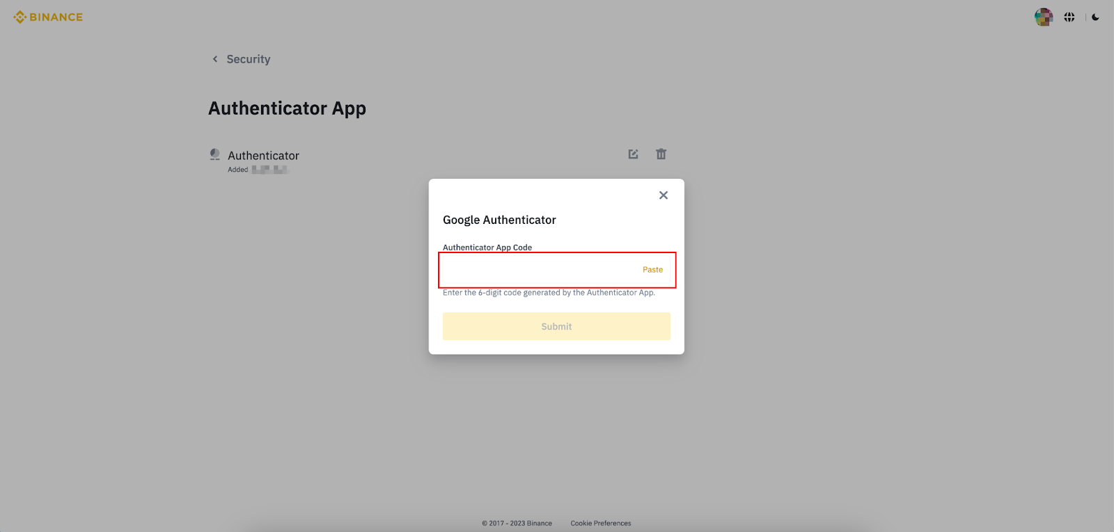 8. 输入您的币安验证器的6位代码,然后点击【提交】。