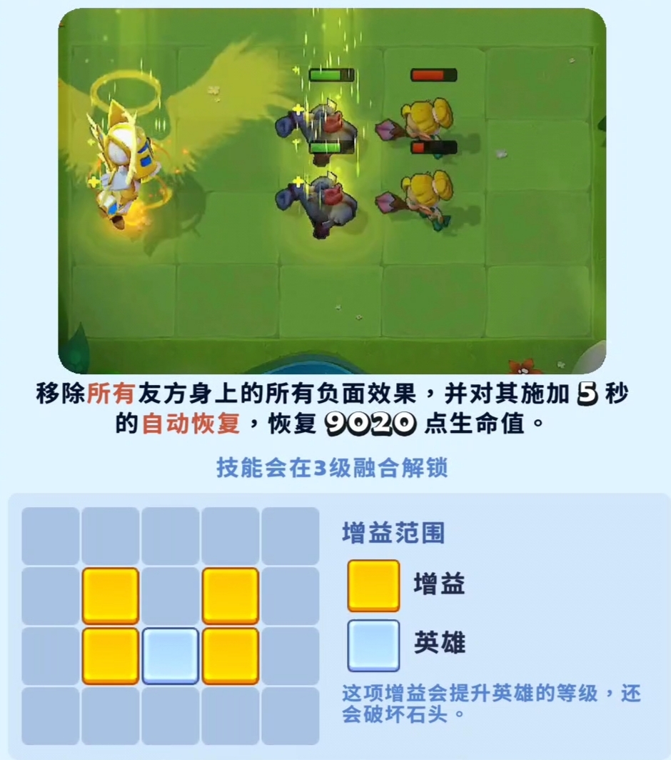 天使的核心技能将在3级融合后激活。释放后,她可以清除所有友方单位身上的负面状态,并为全体队友施加持续5秒的自动回复效果,总计恢复9020点生命值。这一技能在面对带有中毒、灼烧或减防类持续伤害的敌方阵容时尤为关键,能够在团战关键时刻扭转局势,有效防止队友暴毙,提升整体生存能力。