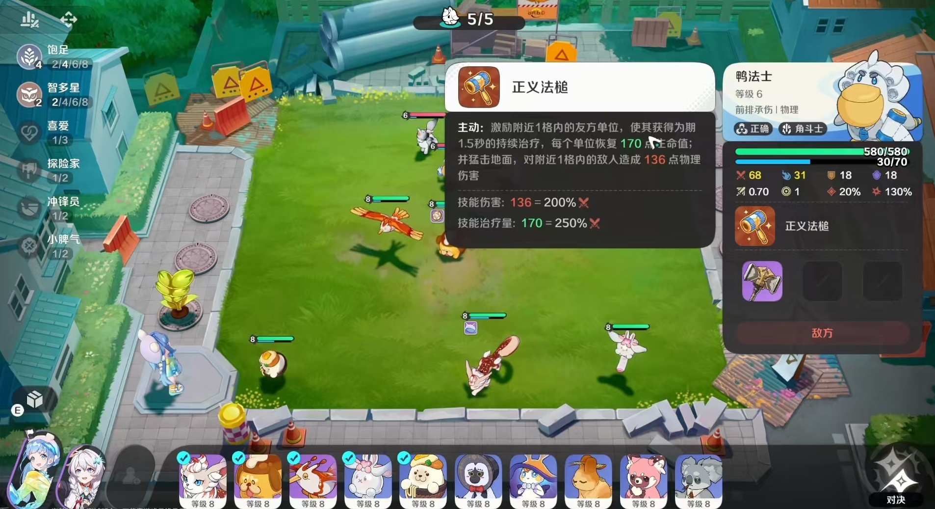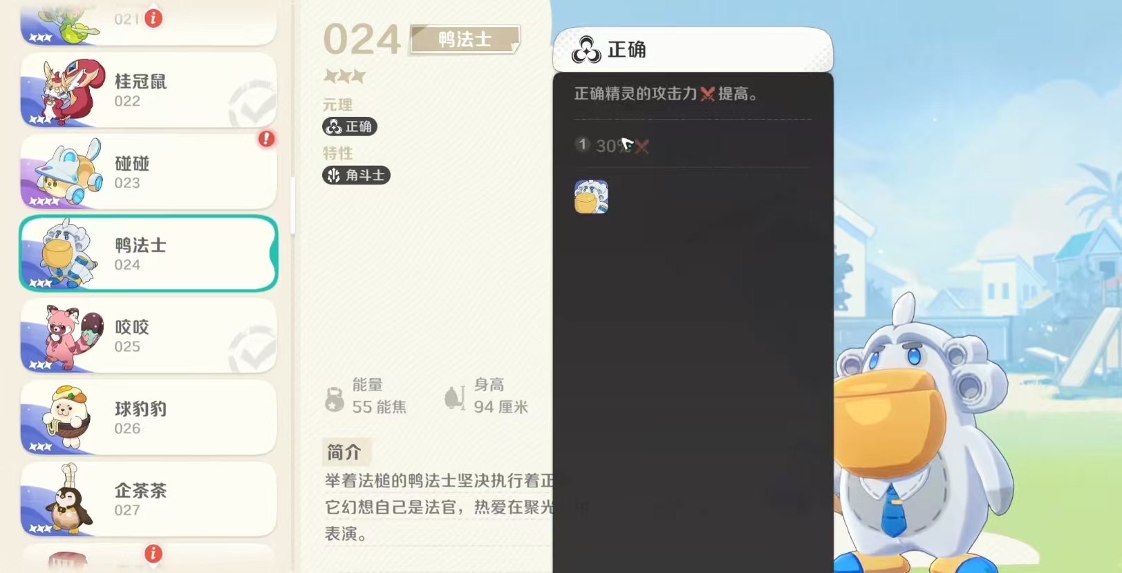 鸭法士的核心设定在于其独有的“正确元理”,这是目前全游戏中唯一具备该属性的精灵,同时它还拥有角斗士特性。它的主动技能名为正义法锤,能够为周围一格范围内的友方单位提供持续1.5秒的治疗效果,并通过锤击地面,对邻近一格内的敌方目标造成基于自身物攻数值的物理伤害。无论是治疗量还是输出强度,均与其物理攻击力直接挂钩。此外,“正确元理”可额外提升自身30%的攻击力,进一步强化输出能力。