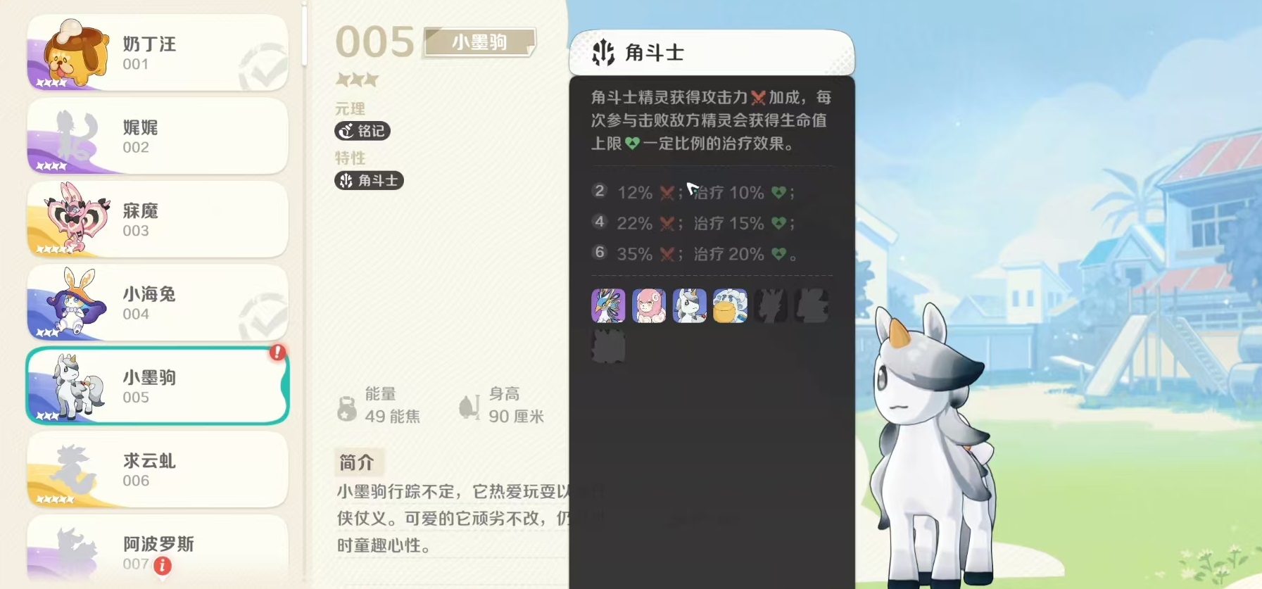 由于“正确元理”尚无其他精灵共享,因此无法触发原理类羁绊加成,但其角斗士身份则带来了明确的阵容发展方向。所有具备角斗士特性的精灵,在战斗中都能获得攻击力增益,且每次参与击杀敌方单位后可回复一定生命值,形成良好的续航循环。