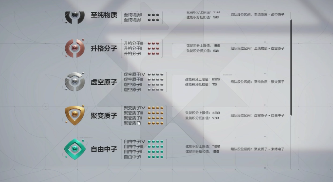 在至纯物质段位中,每个大级别包含三个小阶段,每一阶段需累积三颗星方可晋级。若出现连胜情况,还可获得额外星级奖励。从升格分子到虚空原子阶段,小阶段数量增至四个,且每个阶段必须取得四颗星才能继续晋升。