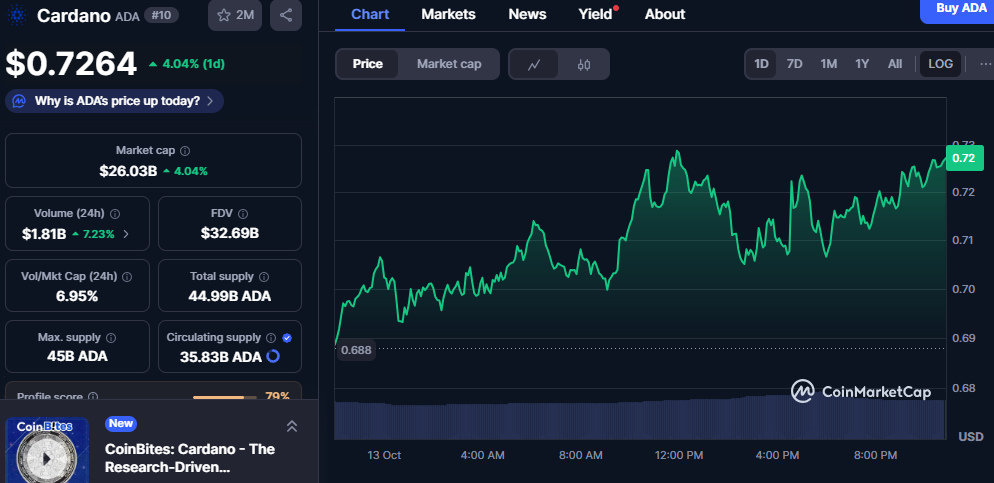 卡尔达诺现价0.7264美元,24小时涨幅4.04%,短期与长期发展态势俱佳,市场信心充足。其市值达260.3亿美元,在大盘市场中保持稳健增长。24小时交易量增长7.23%至18.1亿美元,显示市场参与活跃且流动性持续充沛。
