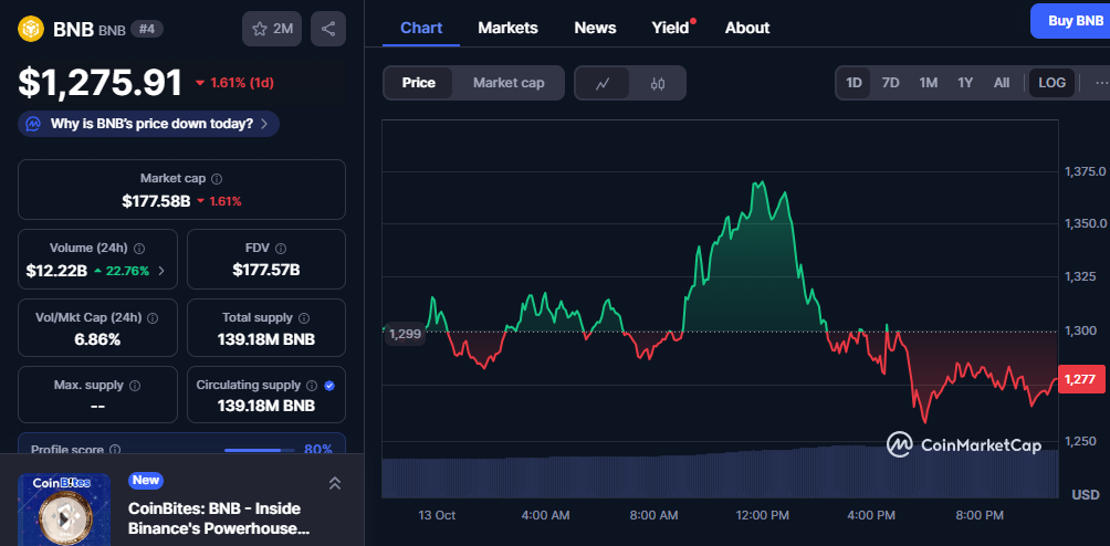 币安币现报1,275.91美元,24小时跌幅1.61%,交易量维持高位但波动率中等。其1,775.8亿美元市值印证了交易所通证的强大影响力。期间交易量增长22.76%至122.2亿美元,显示价格调整后市场参与度仍然活跃。